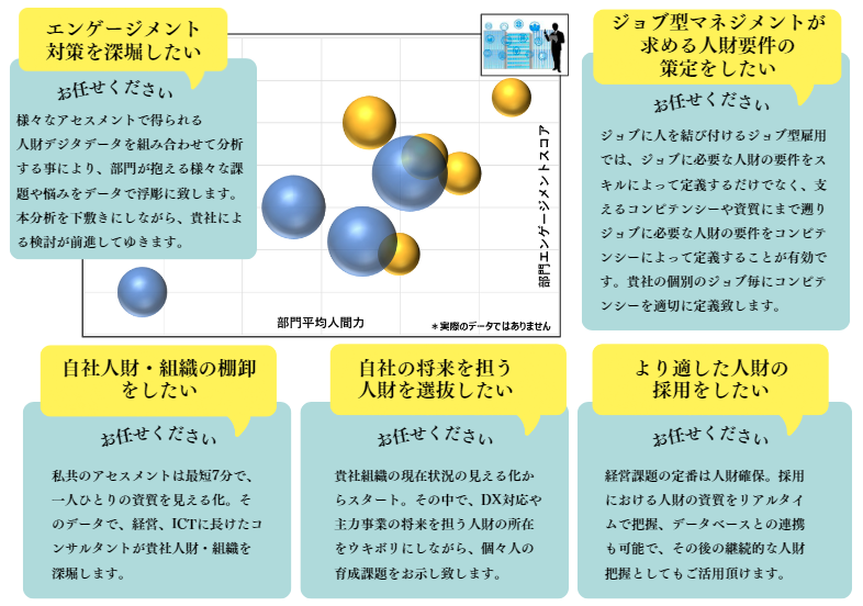 エンゲージメント対策、ジョブ型マネジメントにマッチする人財要件、DX組織作りなど最新の人財・組織戦略構築上の諸課題への対応を行っています。以下はその一例です。